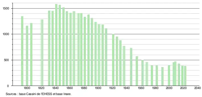 L'évolution du nombre d'habitants est connue à travers les recensements de la population effectués dans la commune depuis 1793. Pour les communes de moins de 10000habitants, une enquête de recensement portant sur toute la population est réalisée tous les cinqans, les populations de référence des années intermédiaires étant quant à elles estimées par interpolation ou extrapolation[21]. Pour la commune, le premier recensement exhaustif entrant dans le cadre du nouveau dispositif a été réalisé en 2008[22].