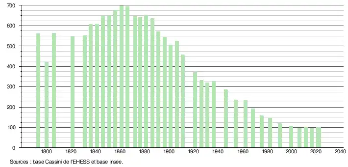 | L'évolution du nombre d'habitants est connue à travers les recensements de la population effectués dans la commune depuis 1793. Pour les communes de moins de 10 000 habitants, une enquête de recensement portant sur toute la population est réalisée tous les cinq ans, les populations de référence des années intermédiaires étant quant à elles estimées par interpolation ou extrapolation[34]. Pour la commune, le premier recensement exhaustif entrant dans le cadre du nouveau dispositif a été réalisé en 2006[35]. En 2022, la commune comptait 100 habitants[Note 7], en évolution de +4,17 % par rapport à 2016 (Tarn : +2,52 %, France hors Mayotte : +2,11 %). |