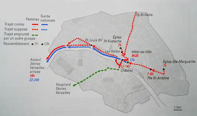 Initialement, la journée du débute par un rassemblement des femmes sur la place de Grève, devant l'hôtel de ville de Paris, pour interpeller la Commune, notamment sur une disette de pain qui touche la capitale. L'Hôtel de ville est d'ailleurs envahi jusqu’à l'arrivée de la Garde nationale, menée par La Fayette. Puis un appel est lancé afin de faire part de ces revendications directement auprès du roi et de l'Assemblée constituante. Ainsi, une foule de plusieurs milliers de personnes, très majoritairement composée de femmes, se met en marche vers Versailles. Elles sont suivies par d'autres groupes armés, puis plusieurs heures plus tard, par 15 000 à 20 000 hommes de la milice nationale.