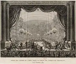 Le , les gardes du corps du roi organisent un banquet en l'honneur du régiment de Flandre. Si ce genre de banquet n'a, à l'époque, rien d'exceptionnel, celui-ci va pourtant choquer une partie des Parisiens. Alors que la disette de pain parisienne est largement connue et relayée par les journaux, un repas est prévu pour 300 convives, et le menu est confié à un traiteur de Versailles, Deharmes, qui fixe le prix à vingt-six livres par tête sans compter les vins, les liqueurs, les glaces ou encore les bougies[19]. Le banquet a lieu dans la grande salle de l'opéra du château de Versailles, salle ordinairement réservée aux banquets des délégations étrangères à Versailles, c'est-à-dire aux plus grands événements. Un orchestre parachève le tout. Les gardes du corps choisissent de n'inviter que des officiers d'autres régiments qui sont du même rang qu'eux, ou qui partagent leurs idées : Laurent Lecointre, malgré son rang important dans la garde de Versailles, n'est pas convié, alors que le sont certains de ceux qui sont sous ses ordres. Lecointre est notoirement un pro-révolutionnaire convaincu. La chose est suffisamment malavisée pour que le commandant-général de la garde, le comte d'Estaing, lui fasse le lendemain des excuses de cette absence d'invitation[20]. Ce banquet est, dès le départ, ressenti comme une provocation. Ce qui s'y déroule ensuite est teinté de cette série de provocations plus ou moins voulues[21].