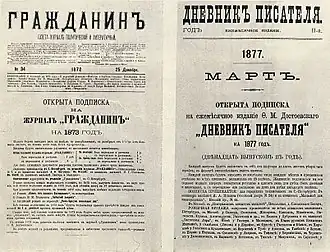 Dostoïevski, nommé rédacteur de l'hebdomadaire très conservateur[4] Le Citoyen[5], a publié dans cette revue une rubrique irrégulière intitulée « Le Journal d’un écrivain ». Le premier supplément date du 1er janvier 1873 ( dans le calendrier grégorien). Les articles de l'écrivain furent réunis en un volume séparé à la fin de l'année. Il a présenté sa démission après quinze mois d'activité.
