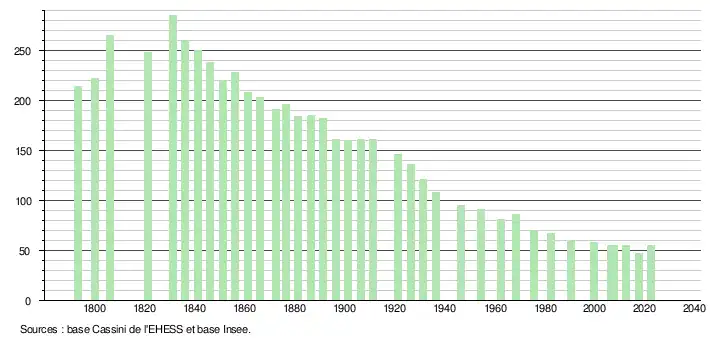L'évolution du nombre d'habitants est connue à travers les recensements de la population effectués dans la commune depuis 1793. Pour les communes de moins de 10 000 habitants, une enquête de recensement portant sur toute la population est réalisée tous les cinq ans, les populations de référence des années intermédiaires étant quant à elles estimées par interpolation ou extrapolation[22]. Pour la commune, le premier recensement exhaustif entrant dans le cadre du nouveau dispositif a été réalisé en 2007[23].