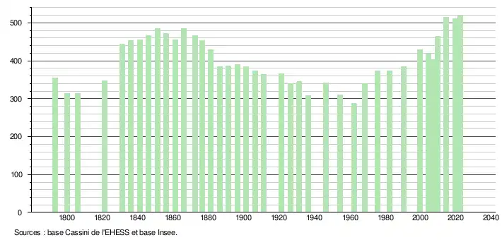 L'évolution du nombre d'habitants est connue à travers les recensements de la population effectués dans la commune depuis 1793. Pour les communes de moins de 10 000 habitants, une enquête de recensement portant sur toute la population est réalisée tous les cinq ans, les populations de référence des années intermédiaires étant quant à elles estimées par interpolation ou extrapolation[14]. Pour la commune, le premier recensement exhaustif entrant dans le cadre du nouveau dispositif a été réalisé en 2004[15].