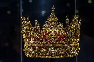 La couronne est le signe visible du pouvoir royal et a été fabriquée par l'orfèvre royal Paul Kurtz à Copenhague dans les années 1670–1671. En tant que couronne du premier monarque absolu, elle a été faite comme une couronne fermée pour avoir un aspect différent des couronnes ouvertes des rois élus, peut-être inspirée de la couronne impériale de Charlemagne[9].