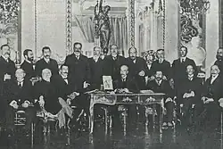 Après le déclenchement de la Grande Guerre[157] les sympathies germanophiles de Mella[158], très partagées par la base du parti, évoluèrent au point de devenir une campagne à part entière[159]. Il écrivit une multitude d'opuscules[160] et donna de nombreuses conférences nourries par sa francophobie personnelle[161] et son sentiment anti-britannique carliste traditionnel[162],[163]. Formellement, ils soutenaient la neutralité espagnole[164],[165] mais ils étaient en réalité favorables aux empires centraux[166]. La position du prétendant demeura ambiguë[167] et ce sont plutôt certains carlistes de son entourage, notamment Melgar, qui s'opposèrent ouvertement à Mella dans leur campagne favorable à l'Entente.