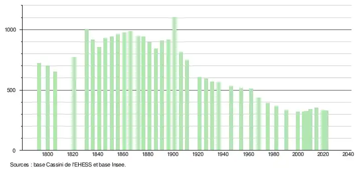 L'évolution du nombre d'habitants est connue à travers les recensements de la population effectués dans la commune depuis 1793. Pour les communes de moins de 10 000 habitants, une enquête de recensement portant sur toute la population est réalisée tous les cinq ans, les populations de référence des années intermédiaires étant quant à elles estimées par interpolation ou extrapolation[27]. Pour la commune, le premier recensement exhaustif entrant dans le cadre du nouveau dispositif a été réalisé en 2004[28].