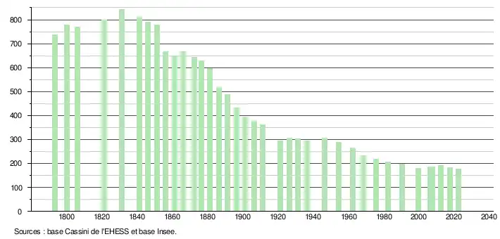 L'évolution du nombre d'habitants est connue à travers les recensements de la population effectués dans la commune depuis 1793. Pour les communes de moins de 10 000 habitants, une enquête de recensement portant sur toute la population est réalisée tous les cinq ans, les populations de référence des années intermédiaires étant quant à elles estimées par interpolation ou extrapolation[25]. Pour la commune, le premier recensement exhaustif entrant dans le cadre du nouveau dispositif a été réalisé en 2007[26].