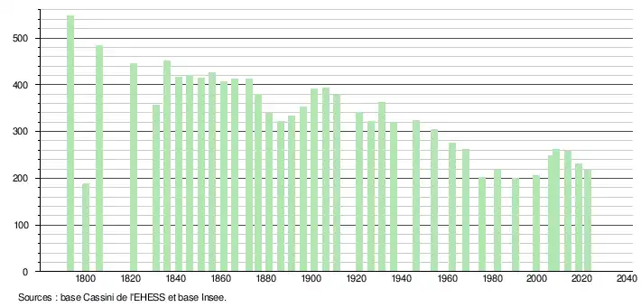 L'évolution du nombre d'habitants est connue à travers les recensements de la population effectués dans la commune depuis 1793. Pour les communes de moins de 10 000 habitants, une enquête de recensement portant sur toute la population est réalisée tous les cinq ans, les populations de référence des années intermédiaires étant quant à elles estimées par interpolation ou extrapolation[33]. Pour la commune, le premier recensement exhaustif entrant dans le cadre du nouveau dispositif a été réalisé en 2008[34].