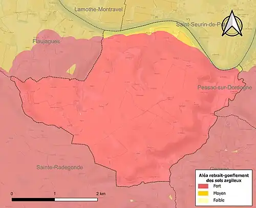 Le retrait-gonflement des sols argileux est susceptible d'engendrer des dommages importants aux bâtiments en cas d’alternance de périodes de sécheresse et de pluie. La totalité de la commune est en aléa moyen ou fort (67,4 % au niveau départemental et 48,5 % au niveau national). Sur les 139 bâtiments dénombrés sur la commune en 2019, 139 sont en aléa moyen ou fort, soit 100 %, à comparer aux 84 % au niveau départemental et 54 % au niveau national. Une cartographie de l'exposition du territoire national au retrait gonflement des sols argileux est disponible sur le site du BRGM[26],[Carte 2].