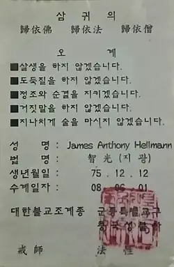En Corée du Sud, le rituel, appelé sugye (수계), consiste à se réfugier formellement dans les trois Trésors du bouddhisme : le Bouddha, le Dharma et la Sangha, et d'accepter les cinq préceptes . Pendant le rituel, l'initié est touché avec un bâton d'encens brûlant. Il s'agit de laisser une marque permanente qui sert à rappeler à l'initié sa promesse de respecter les cinq préceptes. Pendant (ou juste après) la cérémonie, l'initié reçoit un nom bouddhiste[6].