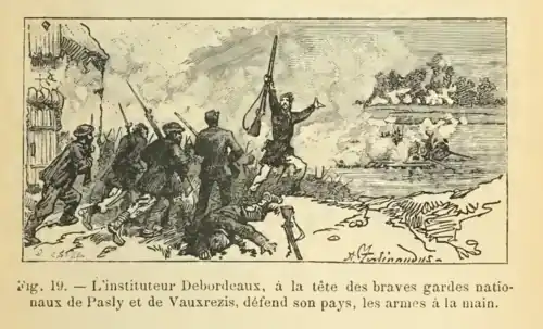 Ancien instituteur de l'école de Sains-Richaumont, le sergent-major Jules Debordeaux enseigne maintenant à Pasly, commune satellite de Soissons depuis 1869. Il jouit d'une légitime influence dans la commune et dans les localités voisines. Le 8 octobre 1870, un groupe de soldats allemands approche de la rivière de l'Aisne, en face du village de Pommiers, à cinq kilomètres de Soissons, planifiant d'installer un pont de bateaux afin de faire traverser leurs régiments. Alerté, Debordeaux qui avait été appelé au commandement de la garde nationale de Pasly avec le grade de sergent-major, va lui-même se rendre compte de la situation, rassemble une cinquantaine d'hommes des villages de Pasly et Vauxrezis, et dans la nuit du 8 au 9 octobre 1870, dirige une opération de résistance armée. Les Prussiens, alors qu'ils sont sur le point de d'arriver à leur fin, sont contrecarrés et fuient[2].