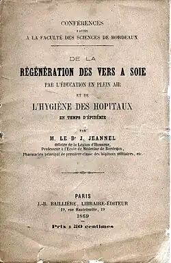 - ↑ Antoine (1845-1927) Balland, Travaux scientifiques des pharmaciens militaires français, par A. Balland,... : Julien-François Jeannel De la régénération des vers à soie par l'éducation en plein air et de l'hygiène des hôpitaux en temps d'épidémie. Paris, J.-B. Baillière, 1869, 28 p., Paris, Asselin, 1882. (lire en ligne)