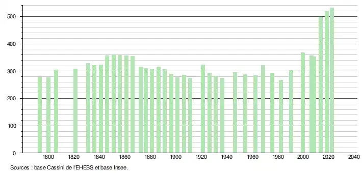 L'évolution du nombre d'habitants est connue à travers les recensements de la population effectués dans la commune depuis 1793. Pour les communes de moins de 10 000 habitants, une enquête de recensement portant sur toute la population est réalisée tous les cinq ans, les populations de référence des années intermédiaires étant quant à elles estimées par interpolation ou extrapolation[40]. Pour la commune, le premier recensement exhaustif entrant dans le cadre du nouveau dispositif a été réalisé en 2008[41].