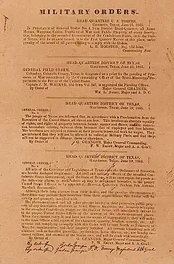 Juneteenth commémore l'annonce faite le par le général Gordon Granger de l'Armée de l'Union, dans la ville de Galveston au Texas, de la libération de tous les esclaves du Texas, relayant ainsi la proclamation présidentielle et décrets fédéraux de 1863 concernant l'abolition de l'esclavage dans les États confédérés. La Proclamation d'émancipation du président Abraham Lincoln était formellement en vigueur dès 1863, et la guerre de Sécession venait de se terminer, mais le Texas était l'un des États esclavagistes les plus éloignés, avec une faible présence des troupes de l'Union, et la mise en œuvre de la proclamation avait été lente et inconsistante[6].