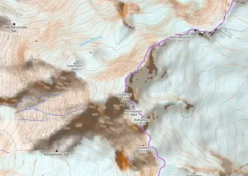 | Voie la plus facile | Arête Sud-Est (PD) depuis le Jungfraujoch | |||