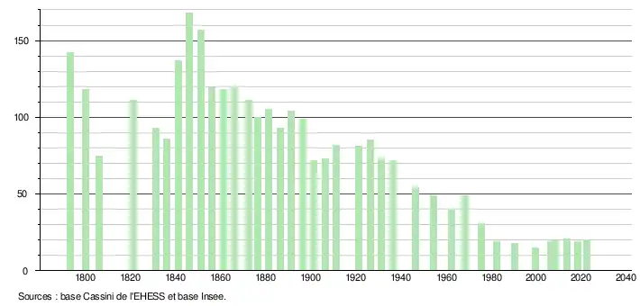 L'évolution du nombre d'habitants est connue à travers les recensements de la population effectués dans la commune depuis 1793. Pour les communes de moins de 10 000 habitants, une enquête de recensement portant sur toute la population est réalisée tous les cinq ans, les populations de référence des années intermédiaires étant quant à elles estimées par interpolation ou extrapolation[32]. Pour la commune, le premier recensement exhaustif entrant dans le cadre du nouveau dispositif a été réalisé en 2008[33].