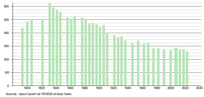 L'évolution du nombre d'habitants est connue à travers les recensements de la population effectués dans la commune depuis 1793. Pour les communes de moins de 10 000 habitants, une enquête de recensement portant sur toute la population est réalisée tous les cinq ans, les populations de référence des années intermédiaires étant quant à elles estimées par interpolation ou extrapolation[31]. Pour la commune, le premier recensement exhaustif entrant dans le cadre du nouveau dispositif a été réalisé en 2007[32].