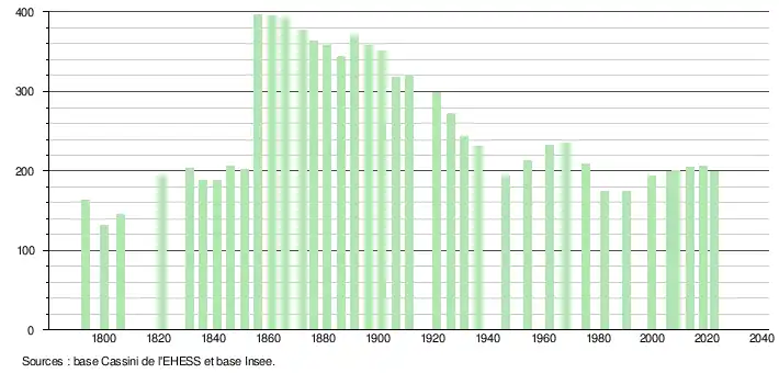 L'évolution du nombre d'habitants est connue à travers les recensements de la population effectués dans la commune depuis 1793. Pour les communes de moins de 10 000 habitants, une enquête de recensement portant sur toute la population est réalisée tous les cinq ans, les populations de référence des années intermédiaires étant quant à elles estimées par interpolation ou extrapolation[34]. Pour la commune, le premier recensement exhaustif entrant dans le cadre du nouveau dispositif a été réalisé en 2008[35].