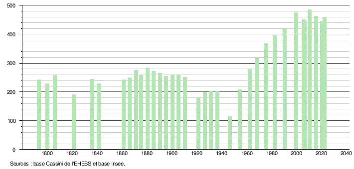 L'évolution du nombre d'habitants est connue à travers les recensements de la population effectués dans la commune depuis 1793. Pour les communes de moins de 10 000 habitants, une enquête de recensement portant sur toute la population est réalisée tous les cinq ans, les populations de référence des années intermédiaires étant quant à elles estimées par interpolation ou extrapolation[18]. Pour la commune, le premier recensement exhaustif entrant dans le cadre du nouveau dispositif a été réalisé en 2005[19].