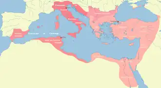 La grande œuvre de la politique extérieure de Justinien est le rétablissement des anciennes frontières de l'Empire romain. Pour cela, il conduit des campagnes militaires expansionnistes sur les anciennes terres romaines et l'Afrique du Nord est sa première cible. La région de Carthage est tombée aux mains des Vandales au début du Ve siècle, qui se sont toujours montrés hostiles à l'Empire romain, rejetant la souveraineté impériale, même nominale et allant jusqu'à mettre Rome à sac en 455[84]. Déjà, Basiliscus a conduit une expédition de très grande envergure (1 100 navires) pour mater ce royaume, mais elle tourne au désastre avec la destruction d'une grande partie de la flotte. En outre, le royaume vandale professe l'arianisme rejeté par Constantinople, accroissant les dissensions entre les deux camps[85]. Si Hildéric, roi depuis , modifie la politique vandale dans un sens plus favorable aux Romains, il est renversé en par Gélimer. Justinien se sert de cet événement pour s'immiscer dans la politique vandale. Il demande au nouveau roi de libérer Hildéric, sans résultats. Plus encore, Gélimer dénonce l'immixtion de Justinien dans les affaires de son royaume. De ce fait, l'empereur décide de conduire une expédition militaire, officiellement pour rétablir Hildéric sur le trône. En outre, il est probablement motivé par la défense des catholiques persécutés. Une autre motivation pourrait être le désir de mettre fin à la piraterie des Vandales et rétablir la domination romaine en Méditerranée[46]. Enfin, il sait que les Maures se soulèvent régulièrement, affaiblissant l'autorité vandale, ce qui le rend confiant quant à la possibilité d'une campagne victorieuse[86],[87].