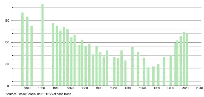 L'évolution du nombre d'habitants est connue à travers les recensements de la population effectués dans la commune depuis 1793. Pour les communes de moins de 10 000 habitants, une enquête de recensement portant sur toute la population est réalisée tous les cinq ans, les populations de référence des années intermédiaires étant quant à elles estimées par interpolation ou extrapolation[22]. Pour la commune, le premier recensement exhaustif entrant dans le cadre du nouveau dispositif a été réalisé en 2008[23].