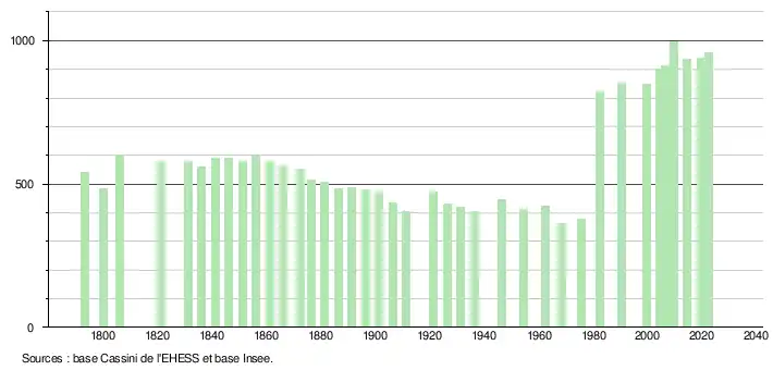 L'évolution du nombre d'habitants est connue à travers les recensements de la population effectués dans la commune depuis 1793. Pour les communes de moins de 10 000 habitants, une enquête de recensement portant sur toute la population est réalisée tous les cinq ans, les populations de référence des années intermédiaires étant quant à elles estimées par interpolation ou extrapolation[39]. Pour la commune, le premier recensement exhaustif entrant dans le cadre du nouveau dispositif a été réalisé en 2004[40].