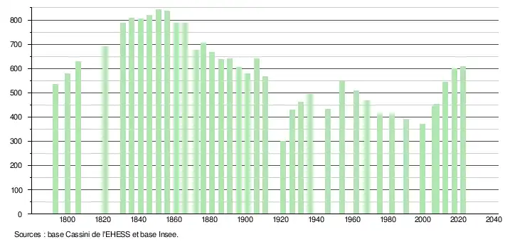 L'évolution du nombre d'habitants est connue à travers les recensements de la population effectués dans la commune depuis 1793. Pour les communes de moins de 10 000 habitants, une enquête de recensement portant sur toute la population est réalisée tous les cinq ans, les populations de référence des années intermédiaires étant quant à elles estimées par interpolation ou extrapolation[34]. Pour la commune, le premier recensement exhaustif entrant dans le cadre du nouveau dispositif a été réalisé en 2007[35].