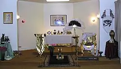 - un culte privé[20], un autel entretenu dans les maisons et un rituel quotidien (daily rite), appelé le Senut[21] chez les khémites orthodoxes ;