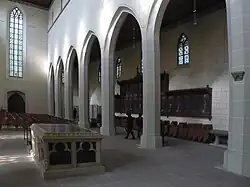 Le cycle des vitraux du chœur, réalisé entre 1325 et 1360, a été conservé dans sa plus grande partie ; il compte parmi les plus importantes des œuvres d'art européennes du XIVe siècle[12]. La plupart des hautes fenêtres gothiques montrent des scènes en cinq parties, chacune consacrée à un thème. Sur le côté sud, toutes les fenêtres n'ont pas été conservées. Dans l'abside est représentée la Passion du Christ, flanquée par des vitraux consacrés à l'Incarnation et à la Résurrection du Christ. La paire de vitraux suivante montre le précurseur, Jean-Baptiste (accompagné de sainte Catherine), et le successeur, l'Apôtre Paul (accompagné de Marie). La troisième paire de vitraux est consacrée aux apôtres. Les deux paires de vitraux suivantes sont dédiées à des saints avec lesquels l'Ordre ou la famille fondatrice avait une relation particulière : saint François, saint Nicolas, sainte Anne et sainte Claire[13].