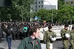 - ↑ (de) Julius Geiler, Madlen Haarbach, Christoph Kluge, Sophie Krause, Silvia Perdoni, Louise Otterbein, Nicolas Lepartz, « 76 Festnahmen, 46 verletzte Polizisten – und beschmierte Bankfiliale », sur tagesspiegel.de, (consulté le )
