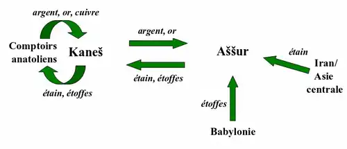 Les échanges de biens peuvent se faire sous différentes modalités. Il y avait des marchés où se vendent du grain, des bêtes, des esclaves, et divers autres biens. Les marchands assyriens vendent de l'étain et des étoffes au palais et à l'élite[48].