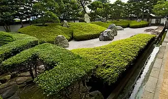 Situé près du bâtiment principal, le jardin de pierres se compose de gravier blanc ratissé, de quelques rhododendrons et de huit rochers qui représente chacun un saint ou un dieu. Le groupe de trois à gauche, entouré de plantes, représentent la trinité Amida, avec Amida Amida Nyorai au centre, Seishi à gauche et la déesse Kannon à droite[1].