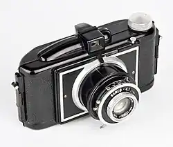 - Kaftax. Sorti vers 1950 c'est un 6 x 9 cm en Bakélite dont la principale originalité face à ses deux concurrents le Photax et l'Utrafex consiste en un tube supportant l'objectif non rentrant ce qui transforme un appareil encombrant en appareil très encombrant ce qui malgré son faible prix lui vaudra un échec commercial[5],[6],[7].