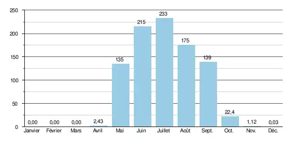 Le débit moyen mensuel observé de janvier à mars (minimum d'étiage) est de 0,00 m3/s, c'est-à-dire arrêt total de l'écoulement, tandis que le débit moyen du mois de juillet se monte à 233 m3/s, ce qui témoigne de l'amplitude extrêmement élevée des variations saisonnières. Sur la durée d'observation de 38 ans, le débit mensuel maximal s'est élevé à 828 m3/s en .