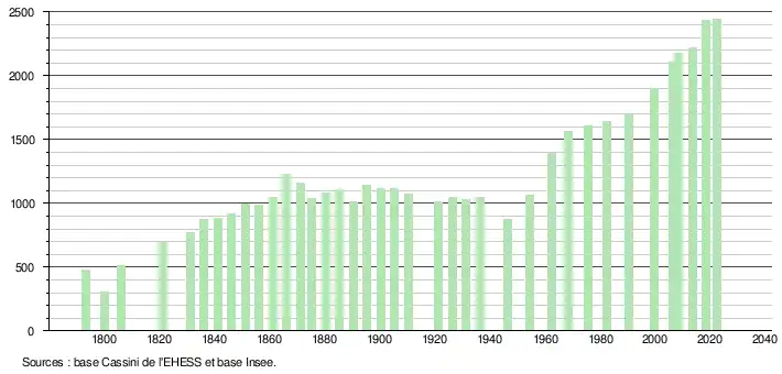 L'évolution du nombre d'habitants est connue à travers les recensements de la population effectués dans la commune depuis 1793. Pour les communes de moins de 10 000 habitants, une enquête de recensement portant sur toute la population est réalisée tous les cinq ans, les populations de référence des années intermédiaires étant quant à elles estimées par interpolation ou extrapolation[27]. Pour la commune, le premier recensement exhaustif entrant dans le cadre du nouveau dispositif a été réalisé en 2008[28].