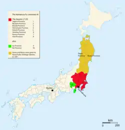 Ashikaga Takauji, fondateur du shogunat Ashikaga qui, au moins nominalement gouverne le Japon durant les XIVe, XVe et XVIe siècles, établit d'abord sa résidence délibérément sur le même site à Kamakura où se trouvait le bakufu d'Ōkura de Yoritomo, mais, en 1336, il laisse Kamakura à la charge de son fils Yoshiakira et part vers l'ouest à la poursuite de Nitta Yoshisada[3]. Des problèmes persistants avec l'empereur Go-Daigo persuadent alors Takauji de la nécessité de rester dans l'est. Les Ashikaga finissent par demeurer en permanence à Kyoto, faisant de Kamakura la capitale du Kamakura-fu (鎌倉府), région comprenant les provinces de Sagami, Musashi, Awa, Kazusa, Shimōsa, Hitachi, Kozuke, Shimotsuke (appelée Hasshū), plus les provinces de Kai et Izu. Le Kamakura-fu est ainsi l'équivalent de l'actuelle région de Kantō, plus les préfectures de Shizuoka et Yamanashi[6]. En 1391, le kubō Ashikaga Ujimitsu est récompensé par le shogun Ashikaga Yoshimitsu pour son assistance contre le clan Yamana avec les deux énormes provinces de Dewa et Mutsu, portant le total à douze provinces.