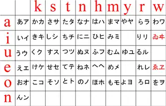 Hiragana k s t n h m y r w a あ か さ た な は ま や ら わ i い き し ち に ひ み り (ゐ) u う く す つ ぬ ふ む ゆ る ん e え け せ て ね へ め れ (ゑ) o お こ そ と の ほ も よ ろ を Katakana k s t n h m y r w a ア カ サ タ ナ ハ マ ヤ ラ ワ i イ キ シ チ ニ ヒ ミ リ (ヰ) u ウ ク ス ツ ヌ フ ム ユ ル ン e エ ケ セ テ ネ ヘ メ レ (ヱ) o オ コ ソ ト ノ ホ モ ヨ ロ ヲ
