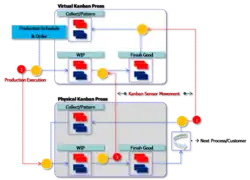 Un kanban électronique typique trace l'inventaire avec des codes-barres, que les opérateurs scannent à différentes étapes du processus de fabrication pour indiquer l'utilisation. Les scanners transmettent l'information aux magasins internes ou externes pour assurer le réapprovisionnement des produits. Le kanban électronique utilise souvent Internet pour acheminer des messages vers les fournisseurs externes[3] et avoir une vue en temps réel des stocks, via un portail, tout au long de la chaîne d'approvisionnement.