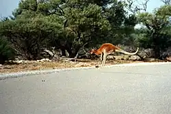 Les kangourous éblouis par les phares ou surpris par les bruits de moteur sautent souvent devant les véhicules, détruisant ou endommageant sévèrement des véhicules petits et non protégés. Le risque de préjudice pour les occupants du véhicule est considérablement augmenté si le pare-brise est le point d'impact. En conséquence, les panneaux « kangaroo crossing » (Passage de kangourous) sont monnaie courante en Australie.