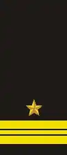 Les insignes du grade sont deux galons larges, séparés par un galon plus fin, sur les manches et les épaulettes.