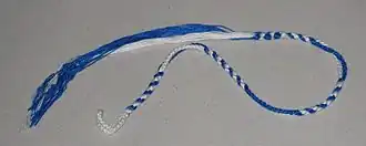 - Les karaïtes portent des tsitsit (franges des vêtements et des châles de prière, et composés de cordeaux blanc et bleu entremêlés) différents des rabbanites. Les karaïtes ne souscrivent pas à l'interprétation rabbinique selon laquelle la couleur tekhelet serait un pigment particulier, et acceptent toute nuance de bleu.