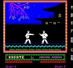 Karate est un jeu vidéo de combat de karaté en 2D pour un ou deux joueurs. Au début du jeu, une image représentant un décor japonais de nuit, avec un cerisier en fleurs et une maison aux fenêtres allumées, s’affiche. Le nom de chaque touche du clavier à utiliser pour contrôler chacun des joueurs est aussi affiché. Cette image reste sur l’écran le temps que le jeu se charge dans la mémoire de l’ordinateur. Le jeu étant enregistré sur une cassette audio, le chargement peut durer plusieurs minutes. Lorsque le chargement du jeu est terminé, le mode démonstration commence. Deux combattants en kimono blanc apparaissent de profil et enchaînent quelques mouvements de base, accompagnés d’une musique jouée par le synthétiseur de l’ordinateur. Un appui sur la barre d'espace du clavier permet de lancer le jeu et d’accéder au menu pour choisir le nombre de joueurs (1 ou 2) et le niveau de difficulté (1 à 9) si un seul joueur est sélectionné. Le combat peut alors commencer. Un combattant est contrôlé à l’aide de cinq touches du clavier, ce qui permet les mouvements suivants : avancer, reculer, attaque bras gauche, attaque bras droit, attaque du pied. Le but du jeu est de porter plusieurs coups au combattant adverse tout en évitant d’en recevoir. Chacun des joueurs dispose de trois vies. Pour chacune des vies, chacun des joueurs peut recevoir quinze coups. Au quinzième coup reçu, un joueur perd une vie. Le joueur qui n’a plus de vie a perdu la partie.