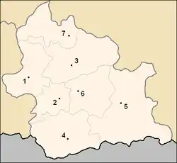 Les noms de localités en caractères gras ont le statut de ville (en bulgare : град, translittéré en grad). Les autres localités ont le statut de village (en bulgare : село translittéré en selo).