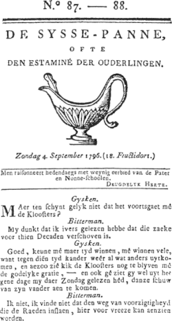 Dans la plupart des numéros, un groupe de personnages fictifs discutent les nouvelles du jour : le républicain tolérant Bitterman (en qui l'on a voulu voir l'incarnation des anciens vonckistes), le radical jacobin Deugdelyk Herte (un nom de plume qui signifie Cœur vertueux, sans doute faisant allusion à un ancien partisan de l'empereur Joseph II), et leur antipode Gysken : un homme représenté comme vieillot, naïf et parlant le patois, qui demeure fidèle au clergé et à l'Ancien Régime, et à qui il ne plaît pas de voir subir son fils Tobias les influences jacobines. La cessation des activités, le , est, selon toute vraisemblance, à mettre en relation avec un resserrement de la politique gouvernementale par rapport à la presse[4].