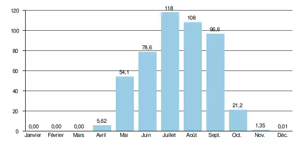 Le débit moyen mensuel observé de janvier à mars (minimum d'étiage) est de 0,00 m3/s, alors que le débit moyen du mois de juillet se monte à 118 m3/s, ce qui signe des variations saisonnières d'amplitude extrême. Sur la durée d'observation de 26 ans, le débit mensuel maximal s'est élevé à 477 m3/s en .