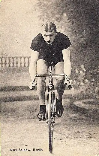 Karl Saldow, apprenti mécanicien, commence à courir en 1908. Il achète son premier vélo de course pour 100 marks au coureur Eugen Stabe (de)[1].