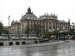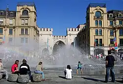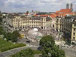 Les bâtiments les plus importants qui dominent la place sont du côté est : la Karlstor, une porte gothique des fortifications médiévales démolies, ainsi que les bâtiments circulaires situés des deux côtés de la porte (construite par Gabriel von Seidl 1899-1902). La porte fut documentée pour la première fois en 1301 et nommée Neuhauser Tor jusqu'en 1791, date à laquelle elle fut renommée Karlstor en l'honneur de Charles Theodore, électeur de Bavière. En été, une grande fontaine est installée devant le Karlstor et en hiver, une patinoire en plein air y est installée. Les bâtiments les plus importants du côté ouest opposé sont le Justizpalast (palais de justice) et le Kaufhof, le premier grand magasin d'après-guerre construit à Munich (par Theo Pabst, 1950-1951). Un nouveau bâtiment est prévu pour l'hôtel Königshof.