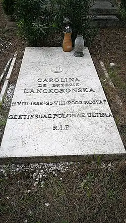 Karolina Lanckorońska décède le 25 août 2002 à Rome, à l'âge de 104 ans. Elle est inhumée au cimetière Campo Verano. Selon sa volonté, une poignée de terre de Pologne est jetée dans sa tombe[4].