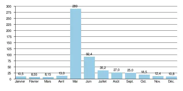 En ce qui concerne la période estivale, libre de glaces (de juin à septembre inclus), le débit mensuel minimal observé a été de 15,8 m3/s en , ce qui restait bien abondant.
