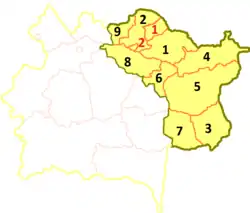 Après le redécoupage de 2022, la province est divisée en 8 districts et 3 villes Öskemen et Ridder[6]